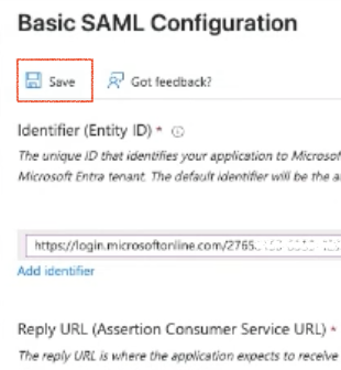 Click Save at the top of the Basic SAML Configuration page to store your settings.