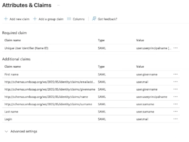 If any values are missing or incorrect, click Add new Claim and update them. Often, "Login", "First name", and "Last name" are missing, and we show below how to create them.