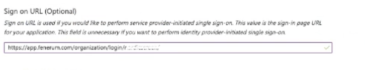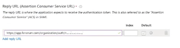 *Reply URL (Assertion Consumer Service URL): Go to https://app.fenerum.com/organization/settings/integrations/ and copy the link under "Individual login URL". In the link, you must replace /login/ with /auth/.