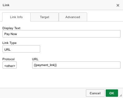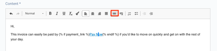 Marker BETAL NÅ-teksten og klikk på ikonet Sett inn/rediger lenke i verktøylinjen.